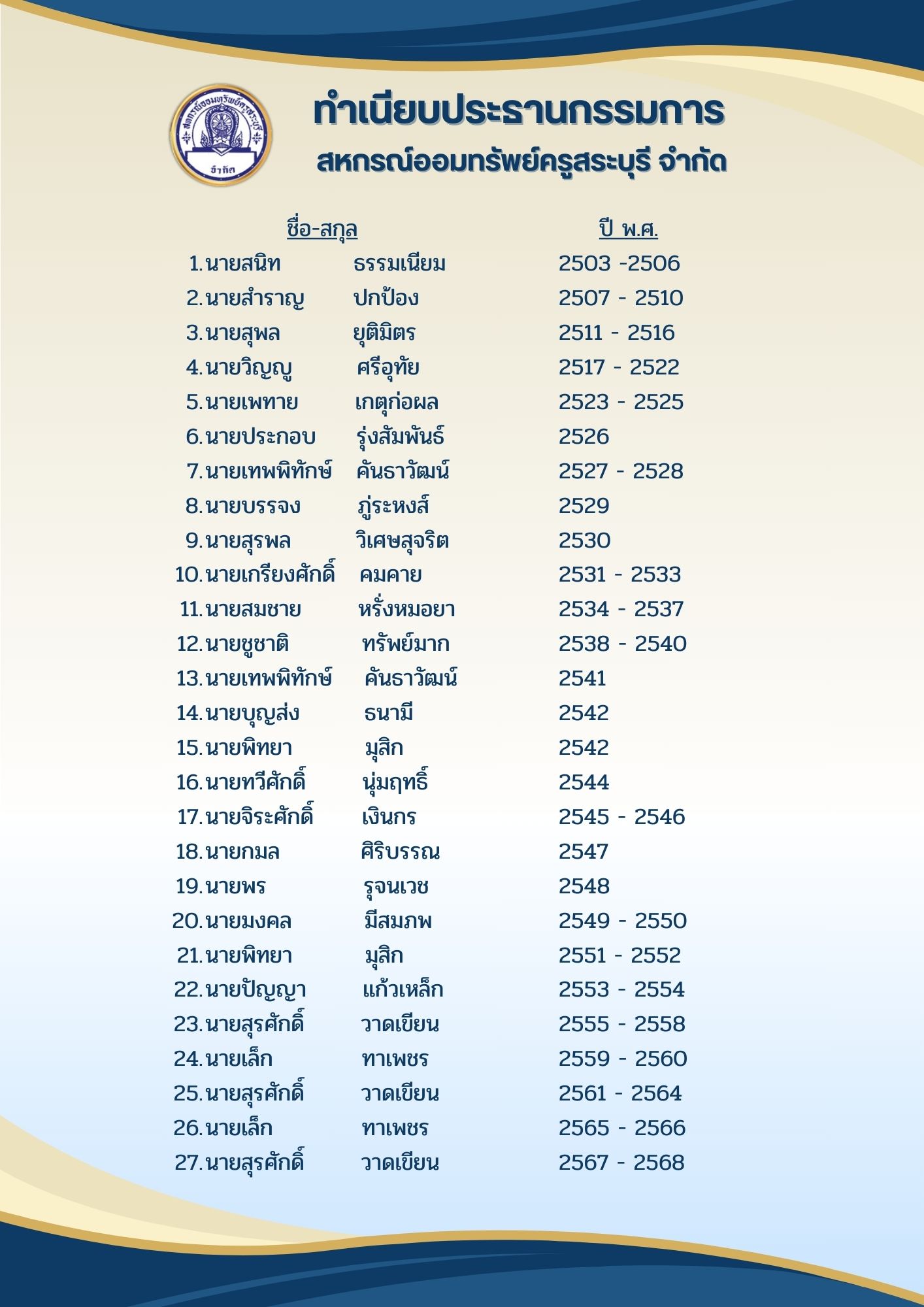 สหกรณ์ออมทรัพย์ครูสระบุรี จำกัด 79 หมู่ 3 ตำบลดาวเรือง อำเภอเมือง จังหวัดสระบุรี รหัสไปรษณีย์ 18000